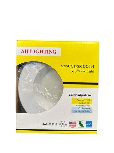 The AH Lighting 5/6" LED 5CCT Smooth Retrofit Kit with Reflector delivers versatile, energy-efficient, and high-lumen performance for both residential and commercial lighting applications. Engineered to fit standard 5" or 6" recessed housings, this retrofit kit includes an E26 connector for quick installation and features smooth reflector trim for a clean, modern finish. Offering 5 selectable color temperatures from 2700K to 5000K, this retrofit kit emits up to 1000 lumens while using only 14 watts, making it a true replacement for higher-wattage incandescent or halogen bulbs. With 90 CRI, instant-on functionality, and no UV or mercury, it's ideal for damp locations, artwork displays, and general indoor lighting. The fixture is UL-listed, Energy Star certified, JA8-2022-E compliant, and meets California Title 24 requirements.