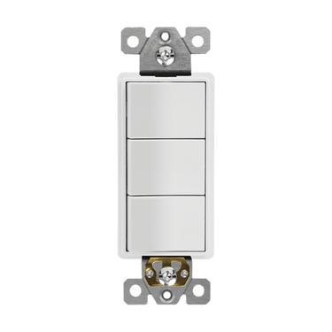 The Enerlites 62755-W is a decorator-style triple rocker switch designed for controlling three separate circuits from a single location. Rated for 15 Amps at 120 VAC, this switch offers reliable performance in residential and commercial electrical systems.