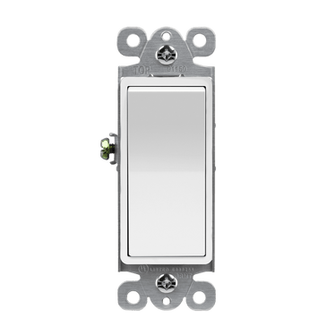 The Enerlites 91150-W Residential Grade Decorator Switch is a reliable single-pole 15A switch designed for both residential and commercial applications. Featuring a smooth, quiet paddle action, this switch ensures easy and silent operation. Constructed with high-impact resistant thermoplastic, it provides durability and long-lasting performance. Its removable yoke tabs allow for perfect alignment during installation, while the captive mounting screws and easy-access green hex head ground screw make wiring straightforward and safe. Compatible with 120/277V systems, this white switch is ideal for updating or installing lighting controls with confidence.
