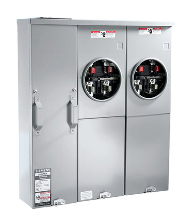 The Siemens WEPK2211 200A 2 Gang Meter Uni-Pak is a compact, EUSERC-approved metering solution designed for duplexes, small apartment buildings, and other multi-tenant service entrances. With two ring-type meter sockets, this unit supports single-phase, 3-wire systems and delivers a maximum bus rating of 200 amps. Each meter socket is rated for 125 amps continuous, and the overall panel carries a robust 100,000 AIC rating for safe, reliable power distribution. UL-listed and built to meet EUSERC utility standards, this meter combo provides durability, code compliance, and easy installation for both residential and light commercial applications.