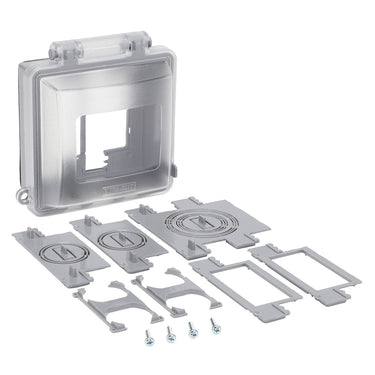 The TITAN3 TWCW2PC Extra Duty 2-Gang Weatherproof In-Use Cover offers superior protection for outdoor electrical outlets with a versatile 73-in-1 insert configuration. Constructed from durable clear non-metallic plastic, it provides easy visibility and access to outlets while maintaining weather resistance. This cover includes multiple inserts to fit duplex, GFCI/decorator, toggle, blank, and round outlet sizes ranging from 1-1/8" up to 2-7/16". It is NEMA 3R rated, UL listed, and complies with the 2014 NEC standard, making it an excellent choice for commercial, residential, and industrial wet-location installations. Designed for maximum adaptability, this cover ensures safe and convenient outdoor power access in any weather.