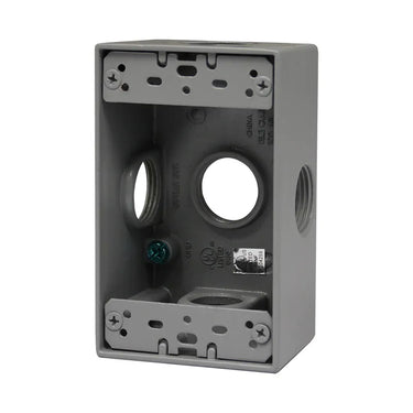 The Westgate W1B75-5X is a sturdy weatherproof electrical outlet box designed for reliable performance in outdoor and wet environments. Made from die-cast aluminum with a protective gray finish, this box features five reinforced 3/4" threaded holes with side outlets for flexible conduit connections. Its NEMA 3R rating ensures excellent protection against moisture and dust, making it ideal for outdoor installations requiring secure and durable housing for electrical outlets.
